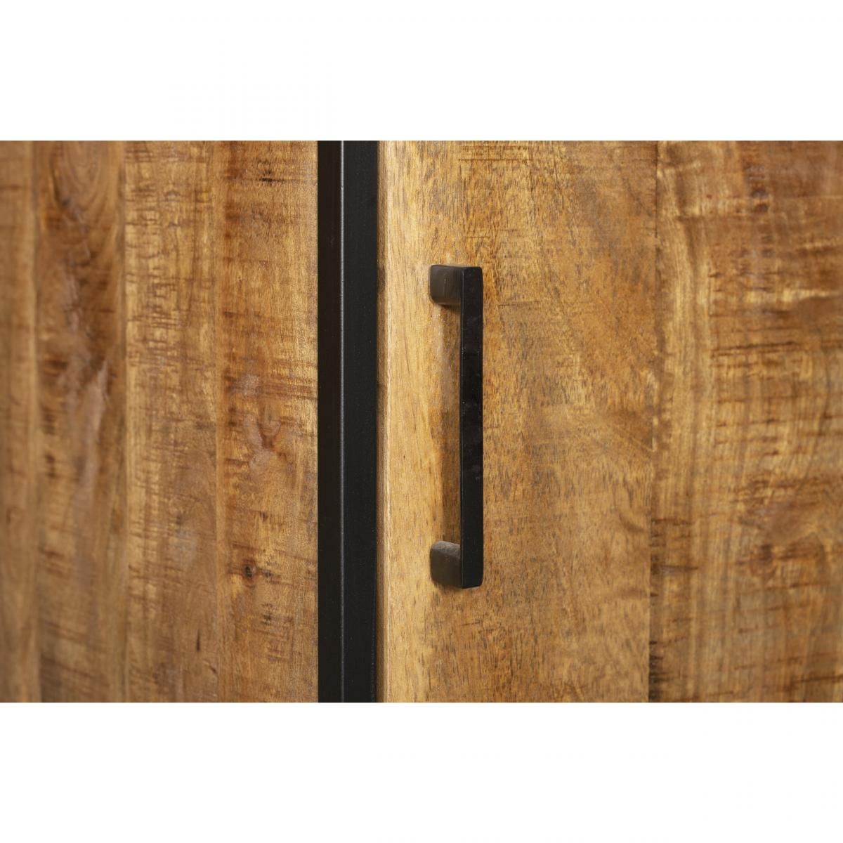 De boekenkast heeft één mangohouten deur en twee stalen legplanken. Het frame en de handgreep zijn gemaakt van metaal en afgewerkt met een stijlvol design.
