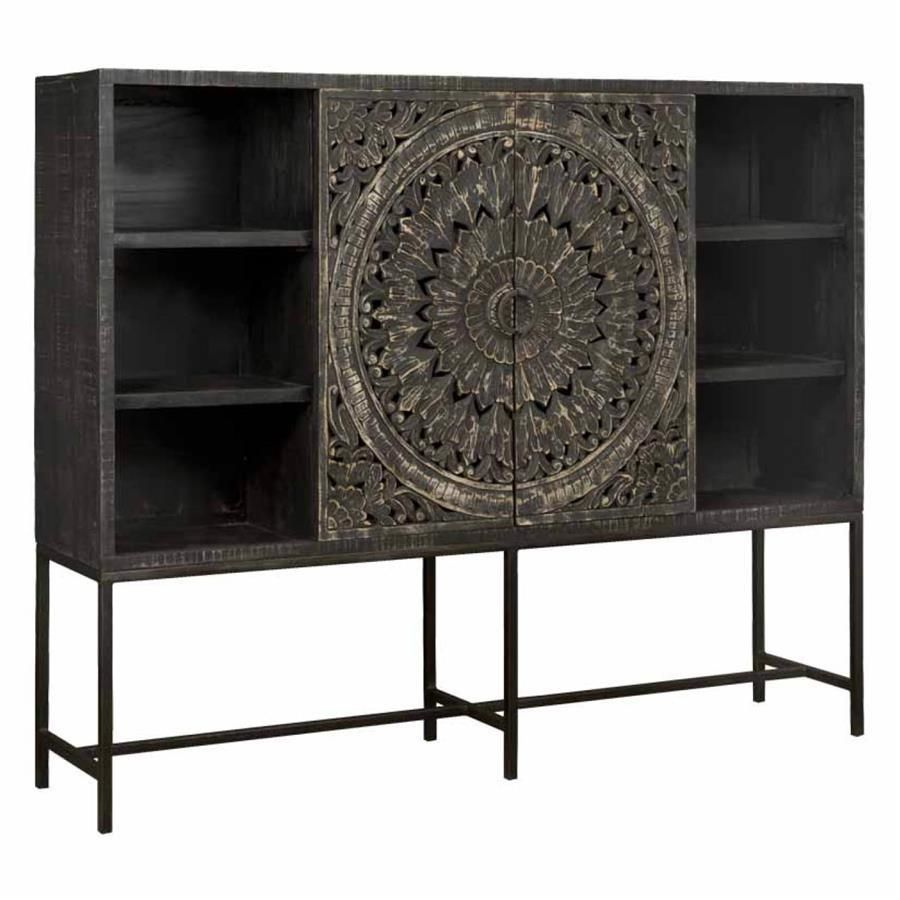 Deze robuuste opbergkast is met zorg vervaardigd uit hoogwaardig hout en staat op een strak, zwart metalen onderstel. De uitvoering in diep zwart, zoals gespecificeerd, geeft de kast een tijdloze en stoere touch. Voor wie op zoek is naar een alternatieve look, is dit model ook verkrijgbaar in een prachtige bronskleurige afwerking. Met een breedte van 200 cm biedt de Casina kast meer dan genoeg opbergruimte achter de twee deuren en in de vier open schappen, waardoor u al uw spullen georganiseerd en stijlvol kunt presenteren.