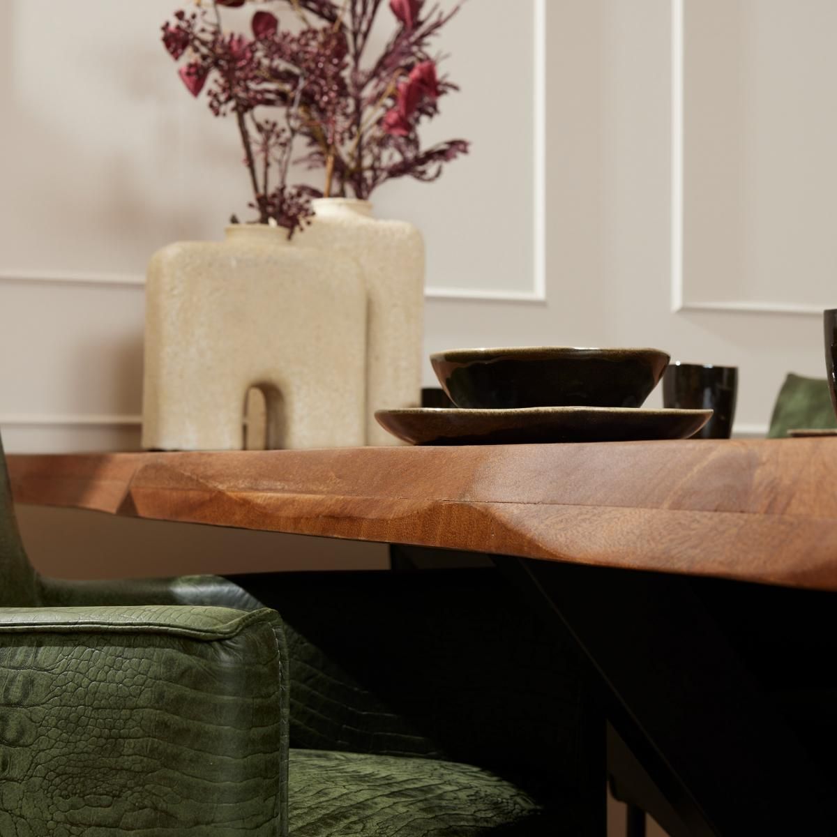 De combinatie van mango hout en metaal geeft deze tafel een sterke en moderne uitstraling.