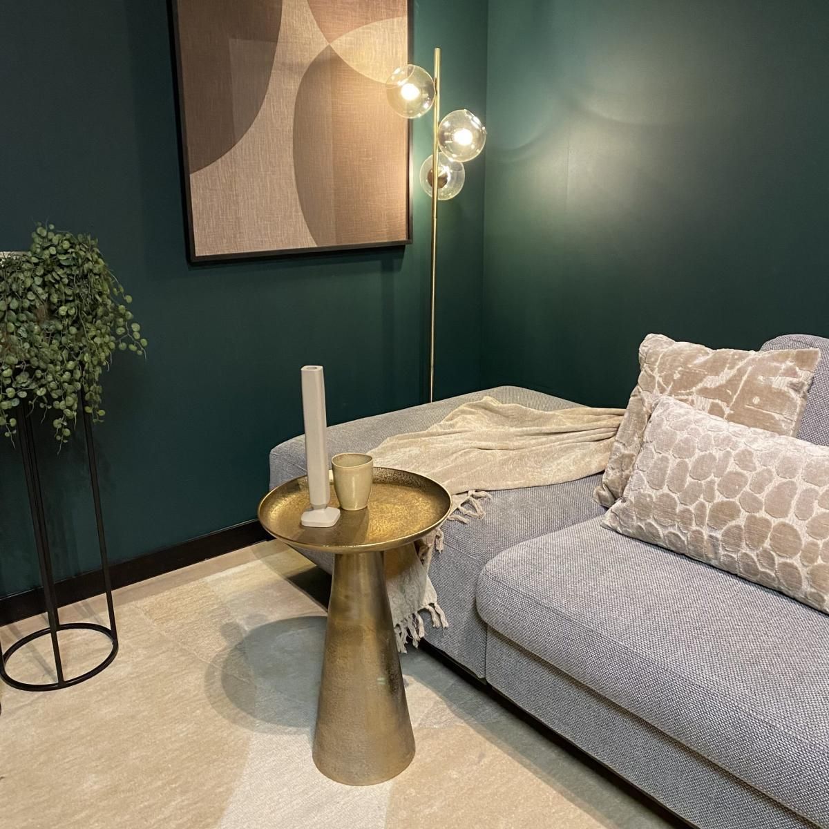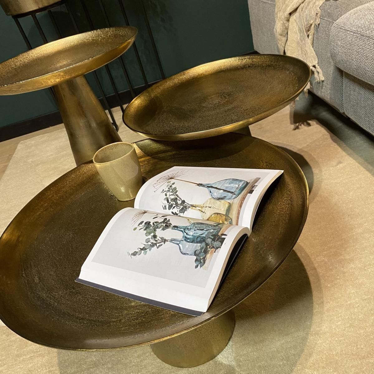 De Salontafel Daisy Medium is gemaakt van aluminium en afgewerkt met een antiek gouden finish, wat een klassieke en elegante uitstraling geeft.