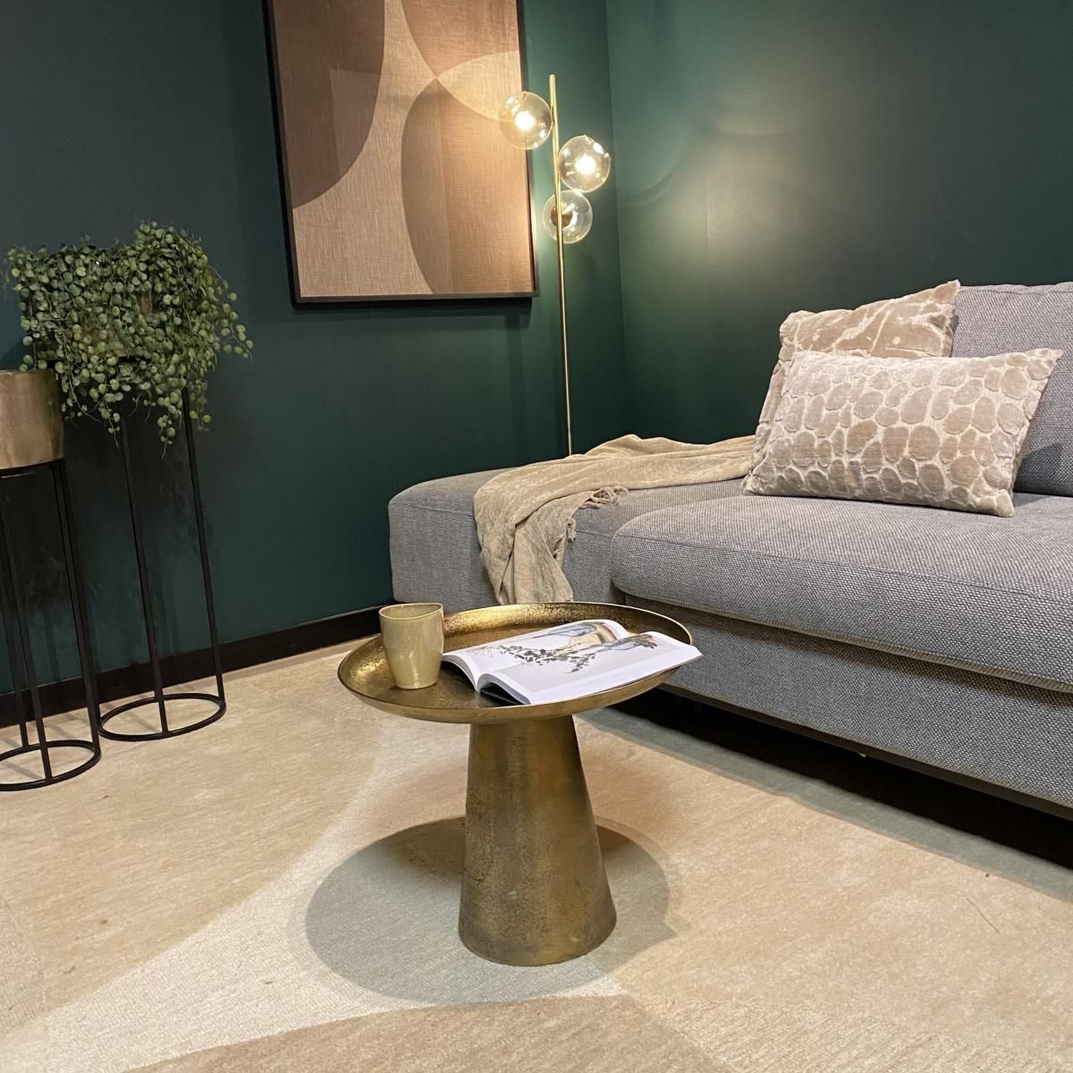 De Salontafel Daisy Medium is een stijlvol en functioneel meubelstuk voor elke woonkamer. Het is gemaakt van aluminium en afgewerkt met een antiek gouden finish, wat een klassieke uitstraling geeft.