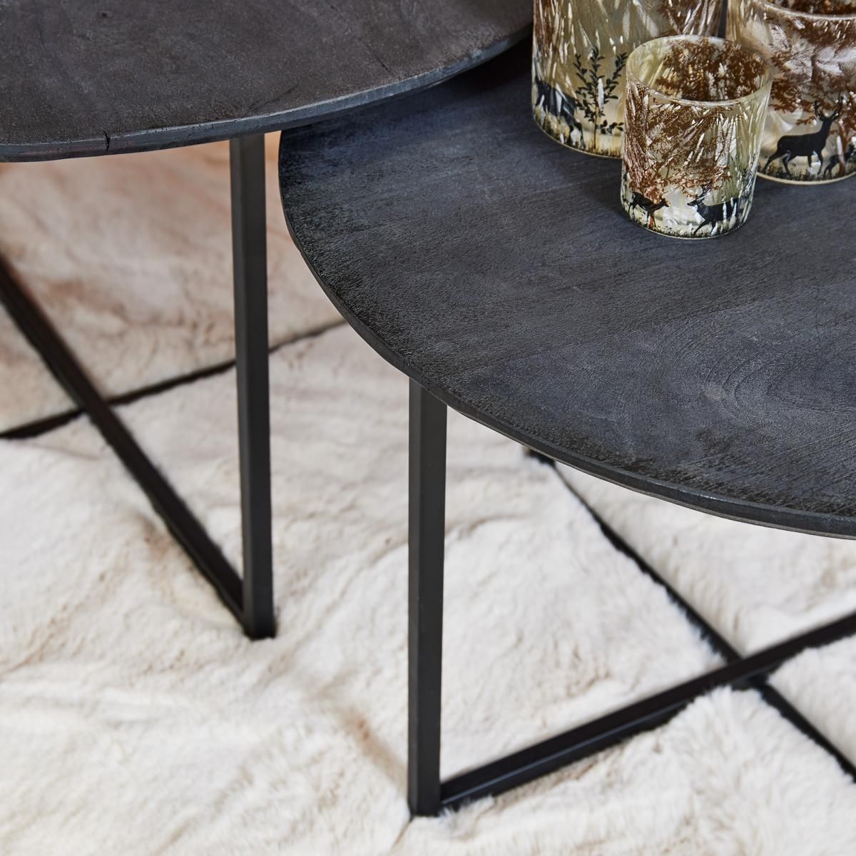 De trendy salontafel set Arlington is gemaakt van mangohout en kun je op een speelse manier onder elkaar schuiven. De tafelbladen zijn gemaakt van mangohout en behandeld met een zwarte lak. Het metalen frame van de tweedelige salontafel set is afgewerkt met een zwarte lak.