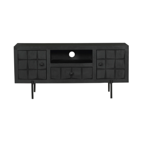 Het tv meubel Brandy Black is voorzien van één open vak, één deurtje en één lade, waardoor het een ideale oplossing is voor het opbergen van media-apparatuur en accessoires. Het meubel is ingelegd met verschillende stroken zwart gelakt hout, wat een unieke en speelse uitstraling geeft door het ingesneden blokken patroon.
