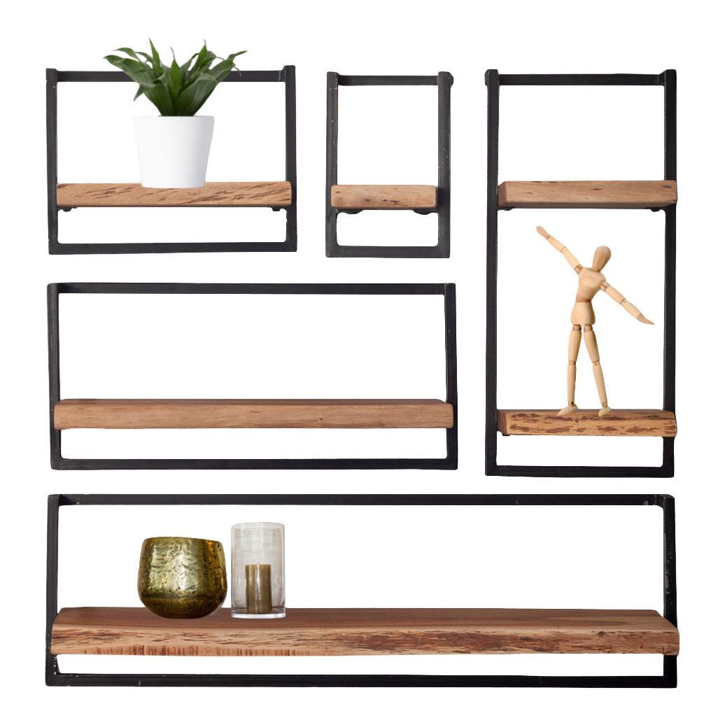 Creëer een gave en unieke wand met deze complete set van vijf wandplanken uit de Woody Metaal-serie! Deze set heeft in totaal een afmeting van (BxHxD) 100x100x25 cm. Hij bestaat uit verschillende massief acaciahouten plankjes, welke aan het uiteinde een gave afgeschuurde boomstamvorm hebben gekregen.
